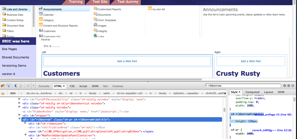 To troubleshoot, I opened up the site in FireFox and used FireFox to look at the HTML and CSS getting spit out. I compared the Wiki Page which was working correctly vs the Web Part Page that wasn’t. I found that this whole area is controlled by the s4-ribbonrow class. When comparing the two, these classes looked exactly the same. On the Web Part Page below the s4-ribbon row CSS was a S4-ribbonrowhidetitle class which had a height set to 135px. This class was not showing up in the wiki page. Sure enough, as soon as I disabled that, everything appeared as normal.